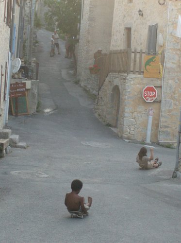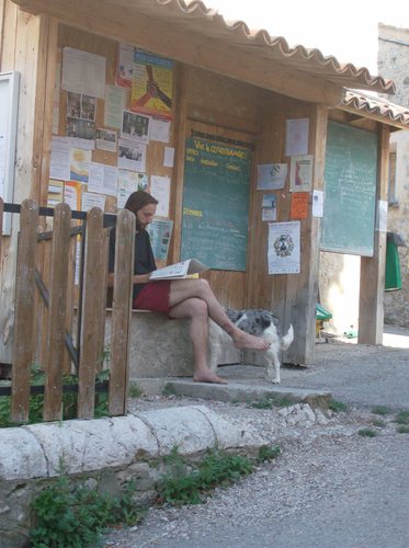 À l'entrée du village, il y a un parking pour les visiteurs. En suivant la route on arrive tout de suite à la mairie, face à laquelle on trouve un grand tableau où chacun peut noter des covoiturages, des manifestations culturelles, des réunions, etc. À quelques pas de la mairie, la placette du centre et sa fontaine – qui tire son eau de la source qui alimente tout le village – sont un véritable lieu de rencontre où l'on croise les uns et les autres, où l'on s'arrête pour discuter, prendre des nouvelles. À peine arrivés, nous saluons déjà tous les gens qui croisent notre route, sans les connaître encore.
