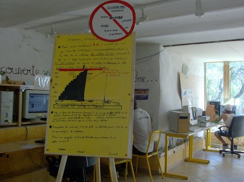 Un cyber-café, séparé de la rue par une simple tenture, est ouvert quasiment 24h/24 et à tout le monde. Il est entretenu par des bénévoles, mais le plus gros se fait tout seul et avec le concours de chacun. Par contre, il y a des fortes contraintes vis-à-vis de la vie en ligne de monsieur et madame Tout-le-monde : la consommation d'Internet (forfait satellite), ne peut pas dépasser un total de 4 Go par mois pour tout le village. Pour les partager au mieux, chacun note sa consommation et laisse un petite somme dans la caisse commune. Les vieux ordinateurs ont été récupérés par Michel. Il y a aussi une radio, organisée de manière simple : c'est quelqu'un du village qui met de la musique dans sa maison et la diffuse au cyber-café. Et « si vous n'entendez rien, c'est que nous écoutons le silence ».