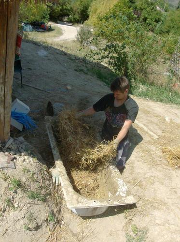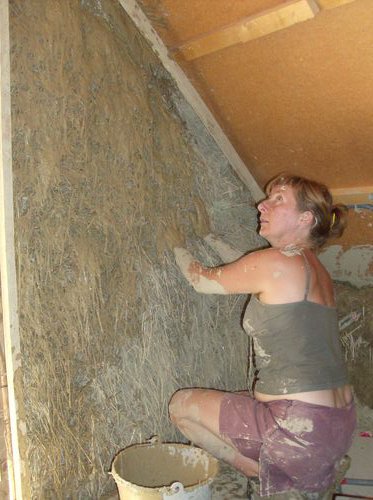 La première couche à poser sur la paille, c'est un mélange de paille et de barbotine : le béton d'argile (sorte de torchis). Plaqué contre la paille, le béton d'argile augmente la résistance mécanique du mur.